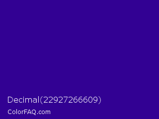 Decimal 22927266609 Color is a dark indigo color and the nearest color is Blue Gem #2c0e8c. Hex code #320193 and RGB value is rgb(50,1,147). In RGB color space, this color is composed of 20% red, 0% green, 58% blue, In CMYK color space, this color is composed of 66% cyan, 99% magenta, 0% yellow , 42% black , In HSL color space, this color has a hue angle of 260° , 99% saturation and 29% lightness.