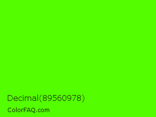 Decimal 89560978 Color is a normal green color and the nearest color is Chlorophyll Green #4aff00. Hex code #54fd00 and RGB value is rgb(84,253,0). In RGB color space, this color is composed of 33% red, 99% green, 0% blue, In CMYK color space, this color is composed of 67% cyan, 0% magenta, 100% yellow , 1% black , In HSL color space, this color has a hue angle of 100° , 100% saturation and 50% lightness.