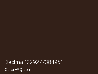 Decimal 22927738496 Color is a very dark orange color and the nearest color is Eclipse #311c17. Hex code #332018 and RGB value is rgb(51,32,24). In RGB color space, this color is composed of 20% red, 13% green, 9% blue, In CMYK color space, this color is composed of 0% cyan, 37% magenta, 53% yellow , 80% black , In HSL color space, this color has a hue angle of 18° , 36% saturation and 15% lightness.