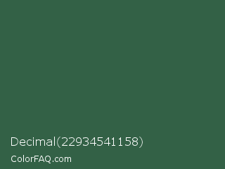 Decimal 22934541158 Color is a dark green color and the nearest color is Killarney #3a6a47. Hex code #336146 and RGB value is rgb(51,97,70). In RGB color space, this color is composed of 20% red, 38% green, 27% blue, In CMYK color space, this color is composed of 47% cyan, 0% magenta, 28% yellow , 62% black , In HSL color space, this color has a hue angle of 145° , 31% saturation and 29% lightness.