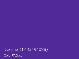 Decimal 1433494088 Color is a normal violet color and the nearest color is Daisy Bush #4f2398. Hex code #522998 and RGB value is rgb(82,41,152). In RGB color space, this color is composed of 32% red, 16% green, 60% blue, In CMYK color space, this color is composed of 46% cyan, 73% magenta, 0% yellow , 40% black , In HSL color space, this color has a hue angle of 262° , 58% saturation and 38% lightness.