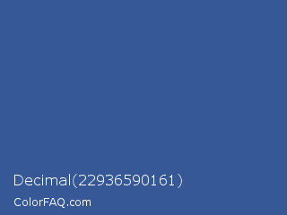 Decimal 22936590161 Color is a normal blue color and the nearest color is B Dazzled Blue #2e5894. Hex code #365897 and RGB value is rgb(54,88,151). In RGB color space, this color is composed of 21% red, 35% green, 59% blue, In CMYK color space, this color is composed of 64% cyan, 42% magenta, 0% yellow , 41% black , In HSL color space, this color has a hue angle of 219° , 47% saturation and 40% lightness.