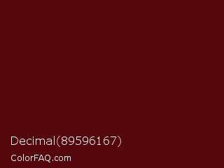 Decimal 89596167 Color is a very dark red color and the nearest color is Mahogany #4e0606. Hex code #55060b and RGB value is rgb(85,6,11). In RGB color space, this color is composed of 33% red, 2% green, 4% blue, In CMYK color space, this color is composed of 0% cyan, 93% magenta, 87% yellow , 67% black , In HSL color space, this color has a hue angle of 356° , 87% saturation and 18% lightness.