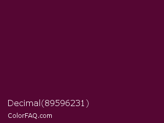 Decimal 89596231 Color is a very dark magenta color and the nearest color is Mulberry Wood #5c0536. Hex code #550633 and RGB value is rgb(85,6,51). In RGB color space, this color is composed of 33% red, 2% green, 20% blue, In CMYK color space, this color is composed of 0% cyan, 93% magenta, 40% yellow , 67% black , In HSL color space, this color has a hue angle of 326° , 87% saturation and 18% lightness.