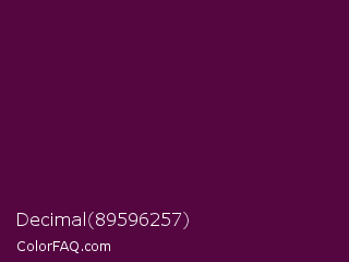 Decimal 89596257 Color is a very dark magenta color and the nearest color is Mulberry Wood #5c0536. Hex code #550641 and RGB value is rgb(85,6,65). In RGB color space, this color is composed of 33% red, 2% green, 25% blue, In CMYK color space, this color is composed of 0% cyan, 93% magenta, 24% yellow , 67% black , In HSL color space, this color has a hue angle of 315° , 87% saturation and 18% lightness.