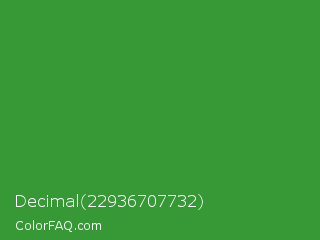 Decimal 22936707732 Color is a normal green color and the nearest color is Wageningen Green #34b233. Hex code #369936 and RGB value is rgb(54,153,54). In RGB color space, this color is composed of 21% red, 60% green, 21% blue, In CMYK color space, this color is composed of 65% cyan, 0% magenta, 65% yellow , 40% black , In HSL color space, this color has a hue angle of 120° , 48% saturation and 41% lightness.