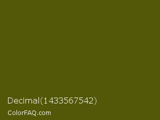 Decimal 1433567542 Color is a very dark yellow color and the nearest color is Saratoga #555b10. Hex code #525808 and RGB value is rgb(82,88,8). In RGB color space, this color is composed of 32% red, 35% green, 3% blue, In CMYK color space, this color is composed of 7% cyan, 0% magenta, 91% yellow , 65% black , In HSL color space, this color has a hue angle of 65° , 83% saturation and 19% lightness.