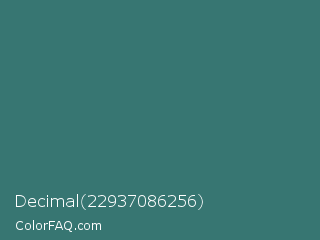 Decimal 22937086256 Color is a normal cyan color and the nearest color is Oracle #377475. Hex code #377672 and RGB value is rgb(55,118,114). In RGB color space, this color is composed of 22% red, 46% green, 45% blue, In CMYK color space, this color is composed of 53% cyan, 0% magenta, 3% yellow , 54% black , In HSL color space, this color has a hue angle of 176° , 36% saturation and 34% lightness.