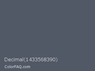Decimal 1433568390 Color is a normal blue color and the nearest color is Scarpa Flow #585562. Hex code #525966 and RGB value is rgb(82,89,102). In RGB color space, this color is composed of 32% red, 35% green, 40% blue, In CMYK color space, this color is composed of 20% cyan, 13% magenta, 0% yellow , 60% black , In HSL color space, this color has a hue angle of 219° , 11% saturation and 36% lightness.