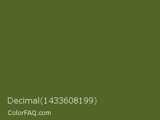 Decimal 1433608199 Color is a dark green color and the nearest color is Dark Olive Green #556b2f. Hex code #526727 and RGB value is rgb(82,103,39). In RGB color space, this color is composed of 32% red, 40% green, 15% blue, In CMYK color space, this color is composed of 20% cyan, 0% magenta, 62% yellow , 60% black , In HSL color space, this color has a hue angle of 80° , 45% saturation and 28% lightness.