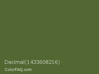Decimal 1433608216 Color is a dark green color and the nearest color is Dark Olive Green #556b2f. Hex code #526732 and RGB value is rgb(82,103,50). In RGB color space, this color is composed of 32% red, 40% green, 20% blue, In CMYK color space, this color is composed of 20% cyan, 0% magenta, 51% yellow , 60% black , In HSL color space, this color has a hue angle of 84° , 35% saturation and 30% lightness.