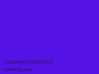 Decimal 89609110 Color is a normal indigo color and the nearest color is Han Purple #5218fa. Hex code #5512e4 and RGB value is rgb(85,18,228). In RGB color space, this color is composed of 33% red, 7% green, 89% blue, In CMYK color space, this color is composed of 63% cyan, 92% magenta, 0% yellow , 11% black , In HSL color space, this color has a hue angle of 259° , 85% saturation and 48% lightness.