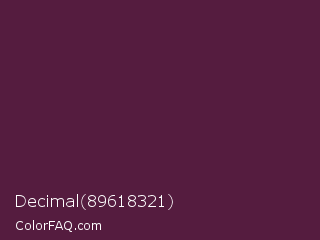 Decimal 89618321 Color is a very dark magenta color and the nearest color is Wine Berry #591d35. Hex code #551c3f and RGB value is rgb(85,28,63). In RGB color space, this color is composed of 33% red, 11% green, 25% blue, In CMYK color space, this color is composed of 0% cyan, 67% magenta, 26% yellow , 67% black , In HSL color space, this color has a hue angle of 323° , 50% saturation and 22% lightness.