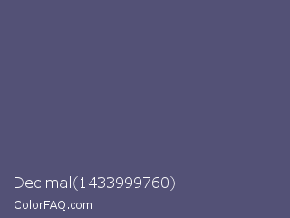 Decimal 1433999760 Color is a normal indigo color and the nearest color is Purple Navy #4e5180. Hex code #535176 and RGB value is rgb(83,81,118). In RGB color space, this color is composed of 33% red, 32% green, 46% blue, In CMYK color space, this color is composed of 30% cyan, 31% magenta, 0% yellow , 54% black , In HSL color space, this color has a hue angle of 243° , 19% saturation and 39% lightness.