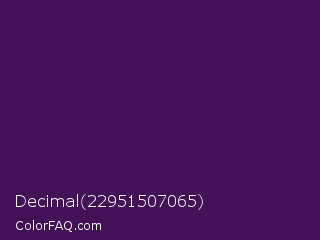 Decimal 22951507065 Color is a very dark purple color and the nearest color is Scarlet Gum #431560. Hex code #431157 and RGB value is rgb(67,17,87). In RGB color space, this color is composed of 26% red, 7% green, 34% blue, In CMYK color space, this color is composed of 23% cyan, 80% magenta, 0% yellow , 66% black , In HSL color space, this color has a hue angle of 283° , 67% saturation and 20% lightness.