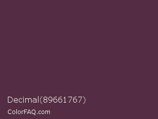 Decimal 89661767 Color is a dark magenta color and the nearest color is Matterhorn #4e3b41. Hex code #552d43 and RGB value is rgb(85,45,67). In RGB color space, this color is composed of 33% red, 18% green, 26% blue, In CMYK color space, this color is composed of 0% cyan, 47% magenta, 21% yellow , 67% black , In HSL color space, this color has a hue angle of 327° , 31% saturation and 25% lightness.