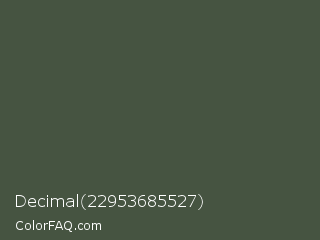 Decimal 22953685527 Color is a dark green color and the nearest color is Gray Asparagus #465945. Hex code #465441 and RGB value is rgb(70,84,65). In RGB color space, this color is composed of 27% red, 33% green, 25% blue, In CMYK color space, this color is composed of 17% cyan, 0% magenta, 23% yellow , 67% black , In HSL color space, this color has a hue angle of 104° , 13% saturation and 29% lightness.