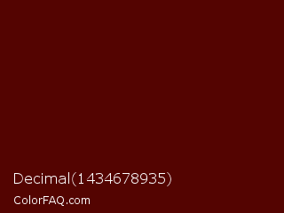 Decimal 1434678935 Color is a very dark red color and the nearest color is Mahogany #4e0606. Hex code #540401 and RGB value is rgb(84,4,1). In RGB color space, this color is composed of 33% red, 2% green, 0% blue, In CMYK color space, this color is composed of 0% cyan, 95% magenta, 99% yellow , 67% black , In HSL color space, this color has a hue angle of 2° , 98% saturation and 17% lightness.