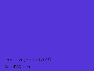 Decimal 89669769 Color is a normal indigo color and the nearest color is Iris #5a4fcf. Hex code #5534d9 and RGB value is rgb(85,52,217). In RGB color space, this color is composed of 33% red, 20% green, 85% blue, In CMYK color space, this color is composed of 61% cyan, 76% magenta, 0% yellow , 15% black , In HSL color space, this color has a hue angle of 252° , 68% saturation and 53% lightness.