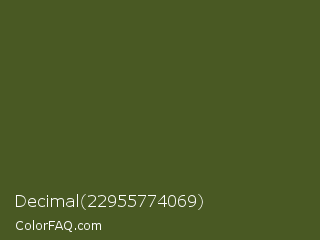 Decimal 22955774069 Color is a dark lime color and the nearest color is Dark Moss Green #4a5d23. Hex code #495923 and RGB value is rgb(73,89,35). In RGB color space, this color is composed of 29% red, 35% green, 14% blue, In CMYK color space, this color is composed of 18% cyan, 0% magenta, 61% yellow , 65% black , In HSL color space, this color has a hue angle of 78° , 44% saturation and 24% lightness.