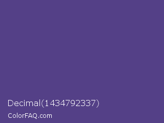 Decimal 1434792337 Color is a normal indigo color and the nearest color is Victoria #534491. Hex code #544087 and RGB value is rgb(84,64,135). In RGB color space, this color is composed of 33% red, 25% green, 53% blue, In CMYK color space, this color is composed of 38% cyan, 53% magenta, 0% yellow , 47% black , In HSL color space, this color has a hue angle of 257° , 36% saturation and 39% lightness.