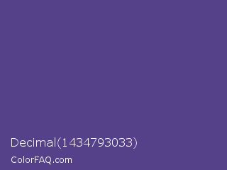 Decimal 1434793033 Color is a normal indigo color and the nearest color is Victoria #534491. Hex code #544189 and RGB value is rgb(84,65,137). In RGB color space, this color is composed of 33% red, 25% green, 54% blue, In CMYK color space, this color is composed of 39% cyan, 53% magenta, 0% yellow , 46% black , In HSL color space, this color has a hue angle of 256° , 36% saturation and 40% lightness.