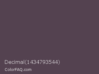 Decimal 1434793544 Color is a dark magenta color and the nearest color is Mortar #504351. Hex code #544250 and RGB value is rgb(84,66,80). In RGB color space, this color is composed of 33% red, 26% green, 31% blue, In CMYK color space, this color is composed of 0% cyan, 21% magenta, 5% yellow , 67% black , In HSL color space, this color has a hue angle of 313° , 12% saturation and 29% lightness.
