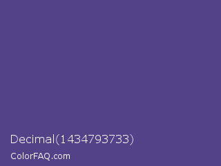 Decimal 1434793733 Color is a normal indigo color and the nearest color is Victoria #534491. Hex code #544289 and RGB value is rgb(84,66,137). In RGB color space, this color is composed of 33% red, 26% green, 54% blue, In CMYK color space, this color is composed of 39% cyan, 52% magenta, 0% yellow , 46% black , In HSL color space, this color has a hue angle of 255° , 35% saturation and 40% lightness.