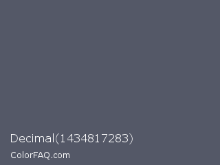 Decimal 1434817283 Color is a normal blue color and the nearest color is Scarpa Flow #585562. Hex code #545867 and RGB value is rgb(84,88,103). In RGB color space, this color is composed of 33% red, 35% green, 40% blue, In CMYK color space, this color is composed of 18% cyan, 15% magenta, 0% yellow , 60% black , In HSL color space, this color has a hue angle of 227° , 10% saturation and 37% lightness.