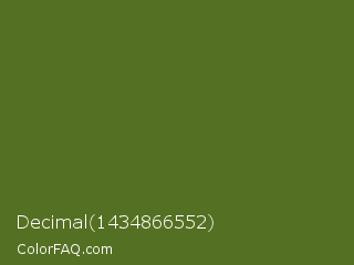 Decimal 1434866552 Color is a dark green color and the nearest color is Dark Olive Green #556b2f. Hex code #547022 and RGB value is rgb(84,112,34). In RGB color space, this color is composed of 33% red, 44% green, 13% blue, In CMYK color space, this color is composed of 25% cyan, 0% magenta, 70% yellow , 56% black , In HSL color space, this color has a hue angle of 82° , 53% saturation and 29% lightness.