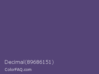 Decimal 89686151 Color is a normal indigo color and the nearest color is Cyber Grape #58427c. Hex code #554477 and RGB value is rgb(85,68,119). In RGB color space, this color is composed of 33% red, 27% green, 47% blue, In CMYK color space, this color is composed of 29% cyan, 43% magenta, 0% yellow , 53% black , In HSL color space, this color has a hue angle of 260° , 27% saturation and 37% lightness.