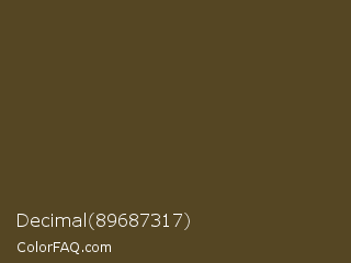 Decimal 89687317 Color is a dark orange color and the nearest color is Irish Coffee #5f3d26. Hex code #554623 and RGB value is rgb(85,70,35). In RGB color space, this color is composed of 33% red, 27% green, 14% blue, In CMYK color space, this color is composed of 0% cyan, 18% magenta, 59% yellow , 67% black , In HSL color space, this color has a hue angle of 42° , 42% saturation and 24% lightness.