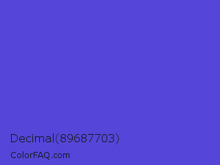 Decimal 89687703 Color is a normal indigo color and the nearest color is Iris #5a4fcf. Hex code #5546d9 and RGB value is rgb(85,70,217). In RGB color space, this color is composed of 33% red, 27% green, 85% blue, In CMYK color space, this color is composed of 61% cyan, 68% magenta, 0% yellow , 15% black , In HSL color space, this color has a hue angle of 246° , 66% saturation and 56% lightness.