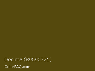 Decimal 89690721 Color is a very dark yellow color and the nearest color is Bronze Olive #4e420c. Hex code #55490d and RGB value is rgb(85,73,13). In RGB color space, this color is composed of 33% red, 29% green, 5% blue, In CMYK color space, this color is composed of 0% cyan, 14% magenta, 85% yellow , 67% black , In HSL color space, this color has a hue angle of 50° , 73% saturation and 19% lightness.
