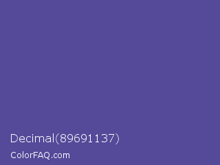 Decimal 89691137 Color is a normal indigo color and the nearest color is Victoria #534491. Hex code #554999 and RGB value is rgb(85,73,153). In RGB color space, this color is composed of 33% red, 29% green, 60% blue, In CMYK color space, this color is composed of 44% cyan, 52% magenta, 0% yellow , 40% black , In HSL color space, this color has a hue angle of 249° , 35% saturation and 44% lightness.