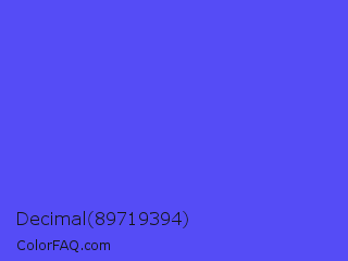 Decimal 89719394 Color is a light indigo color and the nearest color is Majorelle Blue #6050dc. Hex code #554cf6 and RGB value is rgb(85,76,246). In RGB color space, this color is composed of 33% red, 30% green, 96% blue, In CMYK color space, this color is composed of 65% cyan, 69% magenta, 0% yellow , 4% black , In HSL color space, this color has a hue angle of 243° , 90% saturation and 63% lightness.