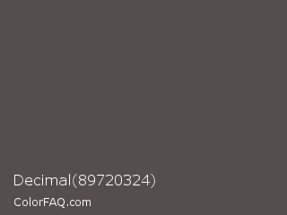 Decimal 89720324 Color is a normal red color and the nearest color is Dark Liver #534b4f. Hex code #554e4c and RGB value is rgb(85,78,76). In RGB color space, this color is composed of 33% red, 31% green, 30% blue, In CMYK color space, this color is composed of 0% cyan, 8% magenta, 11% yellow , 67% black , In HSL color space, this color has a hue angle of 13° , 6% saturation and 32% lightness.