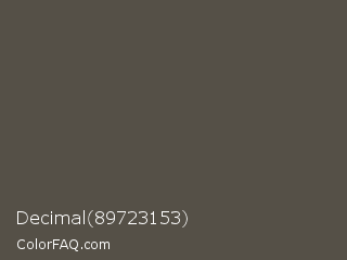 Decimal 89723153 Color is a normal orange color and the nearest color is Fuscous Gray #54534d. Hex code #555047 and RGB value is rgb(85,80,71). In RGB color space, this color is composed of 33% red, 31% green, 28% blue, In CMYK color space, this color is composed of 0% cyan, 6% magenta, 16% yellow , 67% black , In HSL color space, this color has a hue angle of 39° , 9% saturation and 31% lightness.