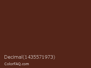 Decimal 1435571973 Color is a very dark red color and the nearest color is Caput Mortuum #592720. Hex code #552519 and RGB value is rgb(85,37,25). In RGB color space, this color is composed of 33% red, 15% green, 10% blue, In CMYK color space, this color is composed of 0% cyan, 56% magenta, 71% yellow , 67% black , In HSL color space, this color has a hue angle of 12° , 55% saturation and 22% lightness.