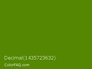 Decimal 1435723632 Color is a dark green color and the nearest color is Avocado #568203. Hex code #558702 and RGB value is rgb(85,135,2). In RGB color space, this color is composed of 33% red, 53% green, 1% blue, In CMYK color space, this color is composed of 37% cyan, 0% magenta, 99% yellow , 47% black , In HSL color space, this color has a hue angle of 83° , 97% saturation and 27% lightness.