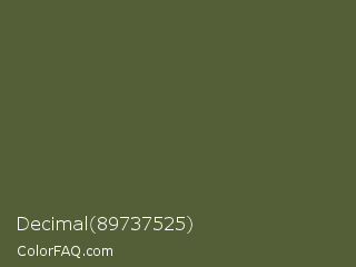 Decimal 89737525 Color is a dark lime color and the nearest color is Verdigris #5d5e37. Hex code #555f37 and RGB value is rgb(85,95,55). In RGB color space, this color is composed of 33% red, 37% green, 22% blue, In CMYK color space, this color is composed of 11% cyan, 0% magenta, 42% yellow , 63% black , In HSL color space, this color has a hue angle of 75° , 27% saturation and 29% lightness.