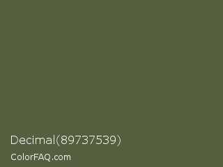 Decimal 89737539 Color is a normal lime color and the nearest color is Hemlock #5e5d3b. Hex code #555f3f and RGB value is rgb(85,95,63). In RGB color space, this color is composed of 33% red, 37% green, 25% blue, In CMYK color space, this color is composed of 11% cyan, 0% magenta, 34% yellow , 63% black , In HSL color space, this color has a hue angle of 79° , 20% saturation and 31% lightness.