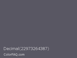 Decimal 22973264387 Color is a normal indigo color and the nearest color is Scarpa Flow #585562. Hex code #595763 and RGB value is rgb(89,87,99). In RGB color space, this color is composed of 35% red, 34% green, 39% blue, In CMYK color space, this color is composed of 10% cyan, 12% magenta, 0% yellow , 61% black , In HSL color space, this color has a hue angle of 250° , 6% saturation and 36% lightness.