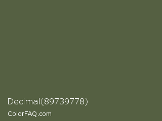 Decimal 89739778 Color is a normal green color and the nearest color is Axolotl #4e6649. Hex code #556042 and RGB value is rgb(85,96,66). In RGB color space, this color is composed of 33% red, 38% green, 26% blue, In CMYK color space, this color is composed of 11% cyan, 0% magenta, 31% yellow , 62% black , In HSL color space, this color has a hue angle of 82° , 19% saturation and 32% lightness.