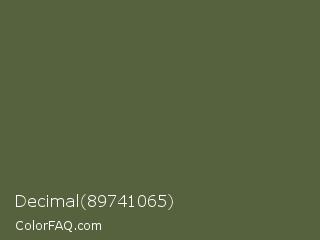 Decimal 89741065 Color is a normal green color and the nearest color is Hemlock #5e5d3b. Hex code #55623d and RGB value is rgb(85,98,61). In RGB color space, this color is composed of 33% red, 38% green, 24% blue, In CMYK color space, this color is composed of 13% cyan, 0% magenta, 38% yellow , 62% black , In HSL color space, this color has a hue angle of 81° , 23% saturation and 31% lightness.