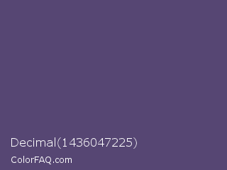 Decimal 1436047225 Color is a normal violet color and the nearest color is Cyber Grape #58427c. Hex code #564673 and RGB value is rgb(86,70,115). In RGB color space, this color is composed of 34% red, 27% green, 45% blue, In CMYK color space, this color is composed of 25% cyan, 39% magenta, 0% yellow , 55% black , In HSL color space, this color has a hue angle of 261° , 24% saturation and 36% lightness.