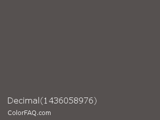 Decimal 1436058976 Color is a normal red color and the nearest color is Fuscous Gray #54534d. Hex code #565150 and RGB value is rgb(86,81,80). In RGB color space, this color is composed of 34% red, 32% green, 31% blue, In CMYK color space, this color is composed of 0% cyan, 6% magenta, 7% yellow , 66% black , In HSL color space, this color has a hue angle of 10° , 4% saturation and 33% lightness.