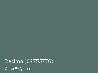 Decimal 89755778 Color is a normal cyan color and the nearest color is Cadet #536872. Hex code #556f6a and RGB value is rgb(85,111,106). In RGB color space, this color is composed of 33% red, 44% green, 42% blue, In CMYK color space, this color is composed of 23% cyan, 0% magenta, 5% yellow , 56% black , In HSL color space, this color has a hue angle of 168° , 13% saturation and 38% lightness.
