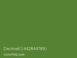 Decimal 1442844789 Color is a normal green color and the nearest color is Sap Green #507d2a. Hex code #568233 and RGB value is rgb(86,130,51). In RGB color space, this color is composed of 34% red, 51% green, 20% blue, In CMYK color space, this color is composed of 34% cyan, 0% magenta, 61% yellow , 49% black , In HSL color space, this color has a hue angle of 93° , 44% saturation and 35% lightness.