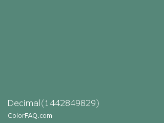 Decimal 1442849829 Color is a normal green color and the nearest color is Wintergreen Dream #56887d. Hex code #568779 and RGB value is rgb(86,135,121). In RGB color space, this color is composed of 34% red, 53% green, 47% blue, In CMYK color space, this color is composed of 36% cyan, 0% magenta, 10% yellow , 47% black , In HSL color space, this color has a hue angle of 163° , 22% saturation and 43% lightness.
